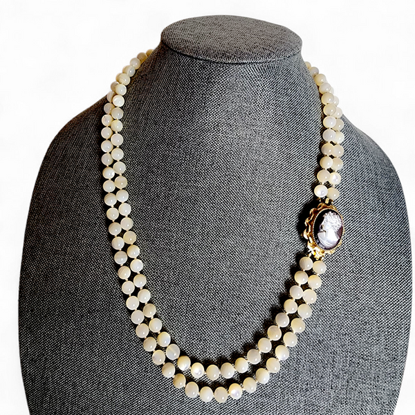 This stunning vintage mother of pearl necklace, featuring polished 22" double strands and a beautifully carved mother of pearl cameo that doubles as a removable brooch. Versatile and timeless, this statement piece can be worn two ways—classic necklace or elegant brooch.